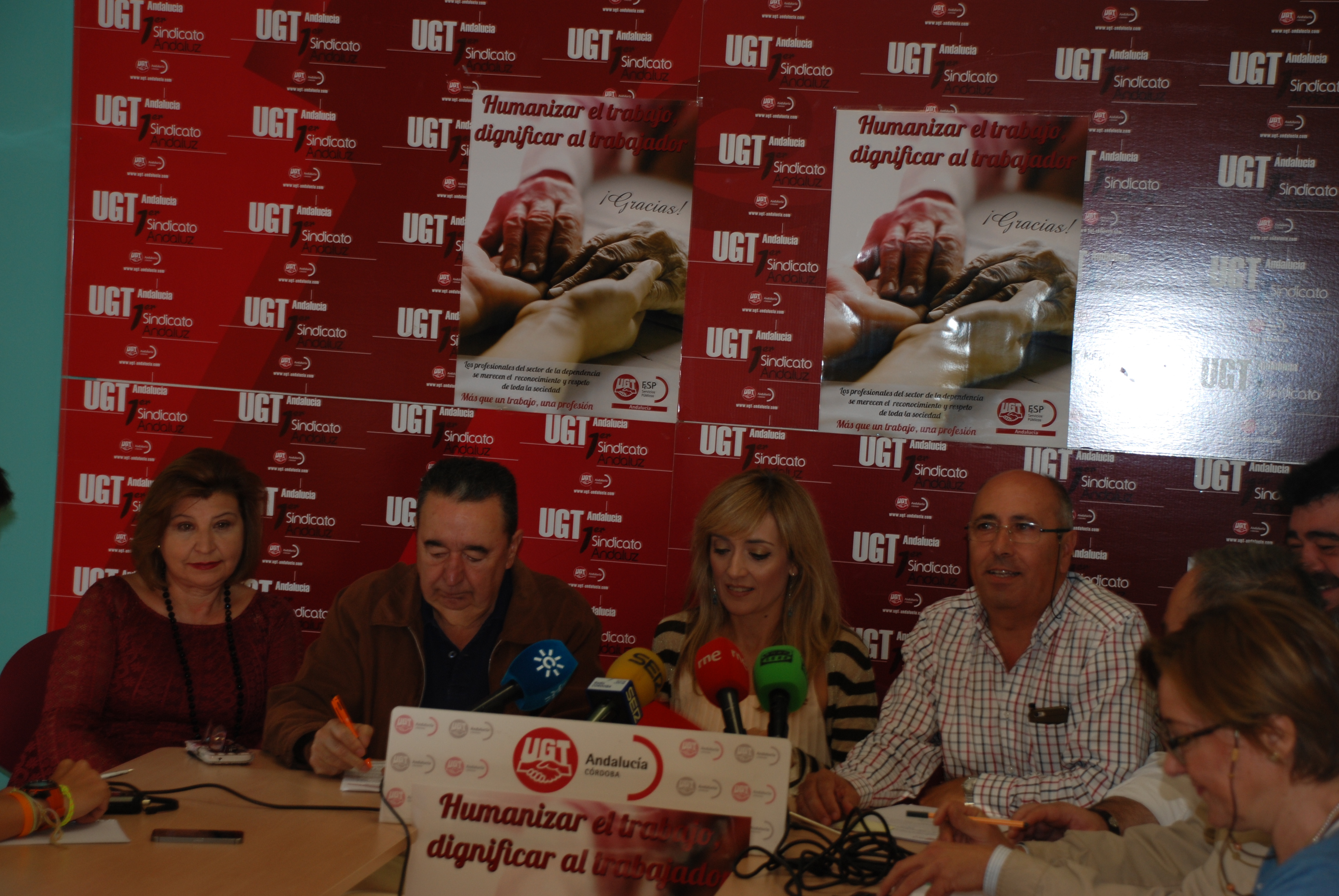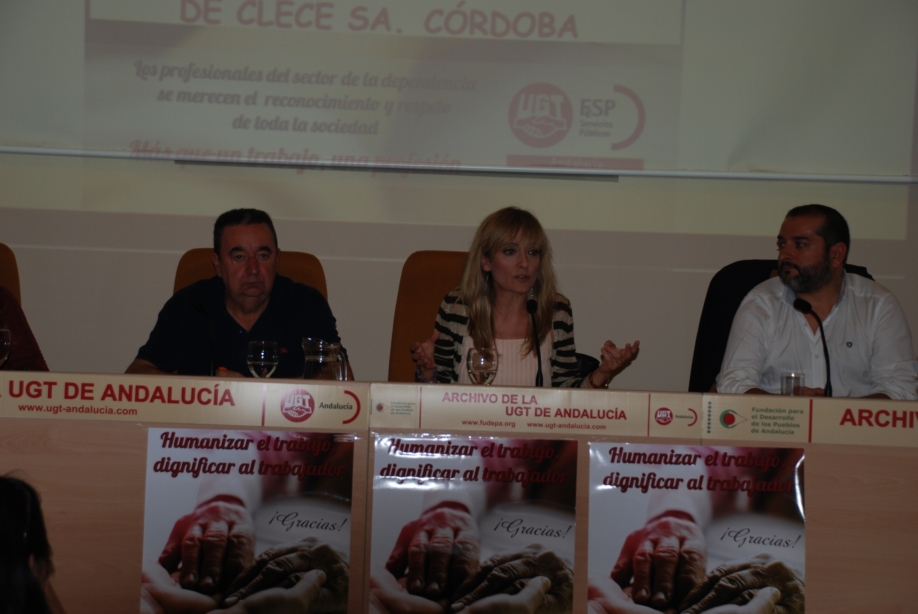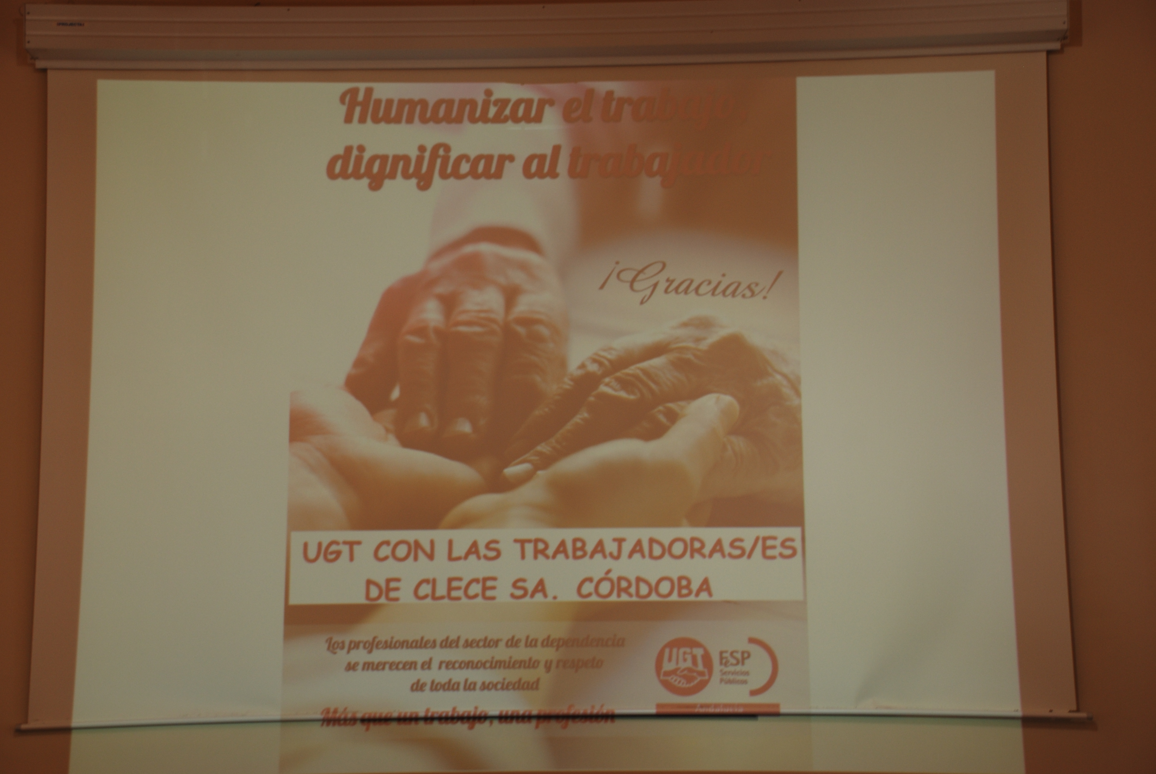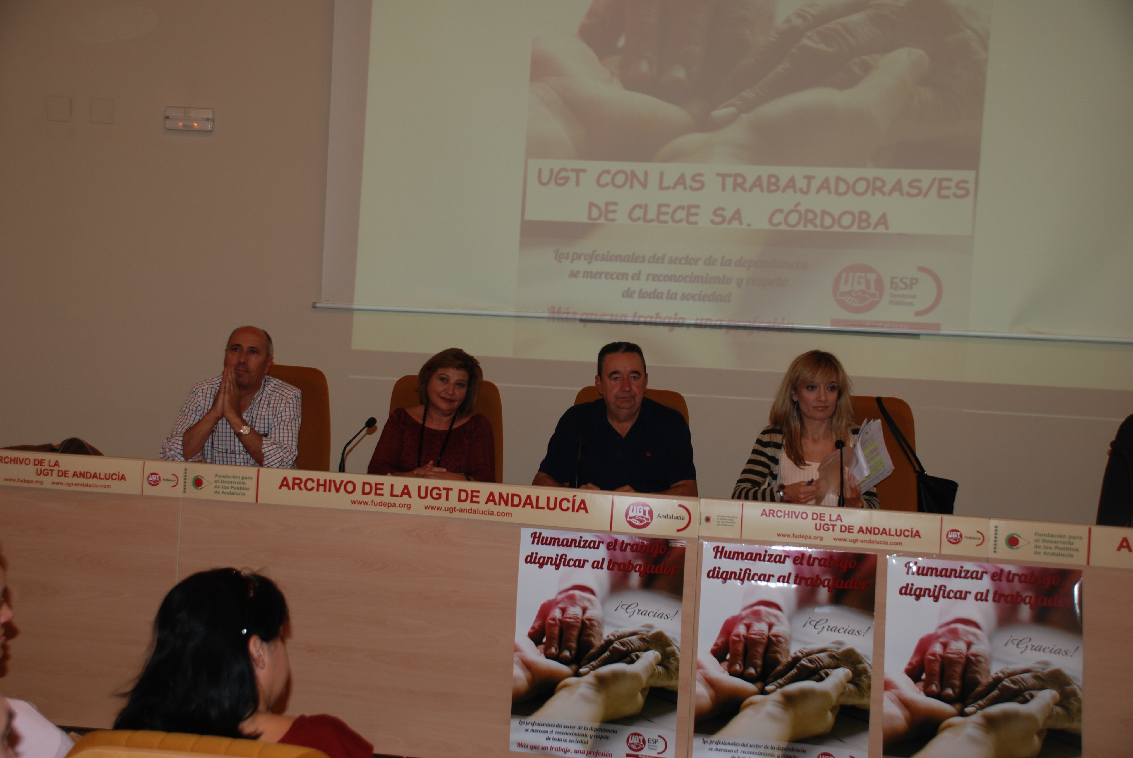 La Jornada comenzó con una rueda de prensa en la que intervinieron Carmen Castilla, Secretaria General de UGT Andalucía; Antonio Tirado, Secretario General de FeSP-UGT Andalucía; Isaías Ortega, Secretario General de FeSP-UGT Córdoba y Rosario Crespo, Responsable de la Sección Sindical de Ayuda a Domicilio de FeSP-UGT Córdoba. En dicha rueda de prensa, se puso de manifiesto la importante labor y el magnífico trabajo que están realizando las compañeras y compañeros de la Sección Sindical de UGT en la empresa CLECE, en la que, en unos años, han conseguido con su acción sindical convertir hasta el 80% de la plantilla en personal indefinido y, entre otras muchas cuestiones, la readmisión de muchas trabajadoras y trabajadores que habían sido despedidos de manera improcedente.