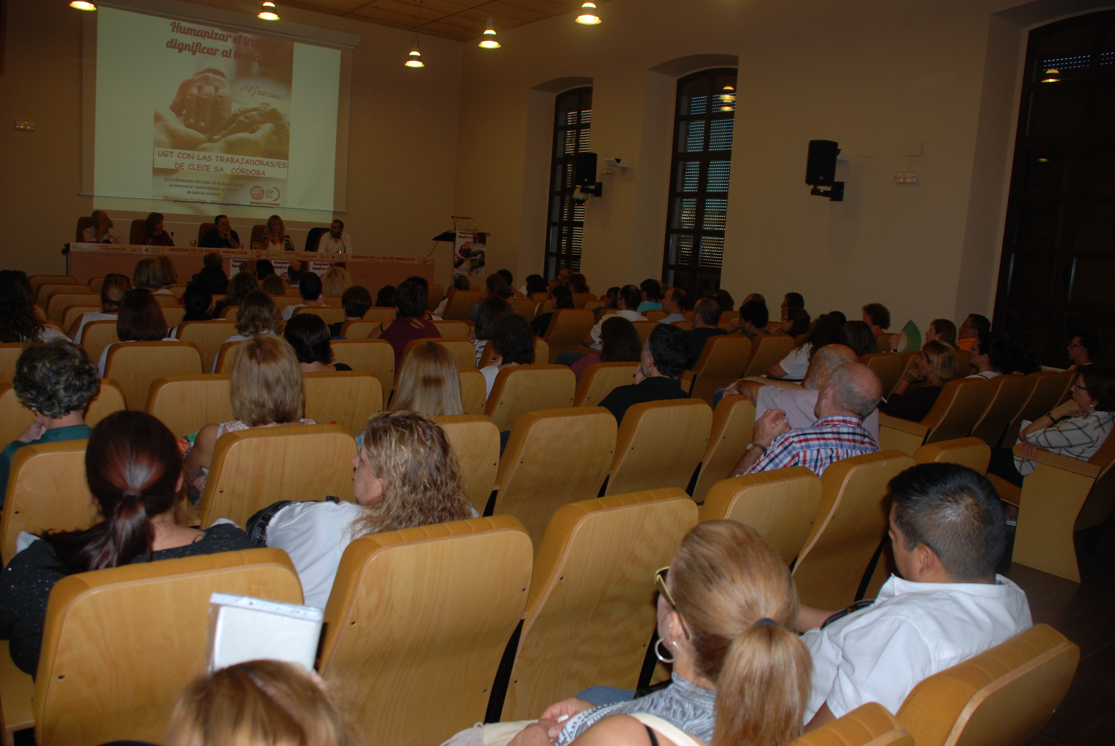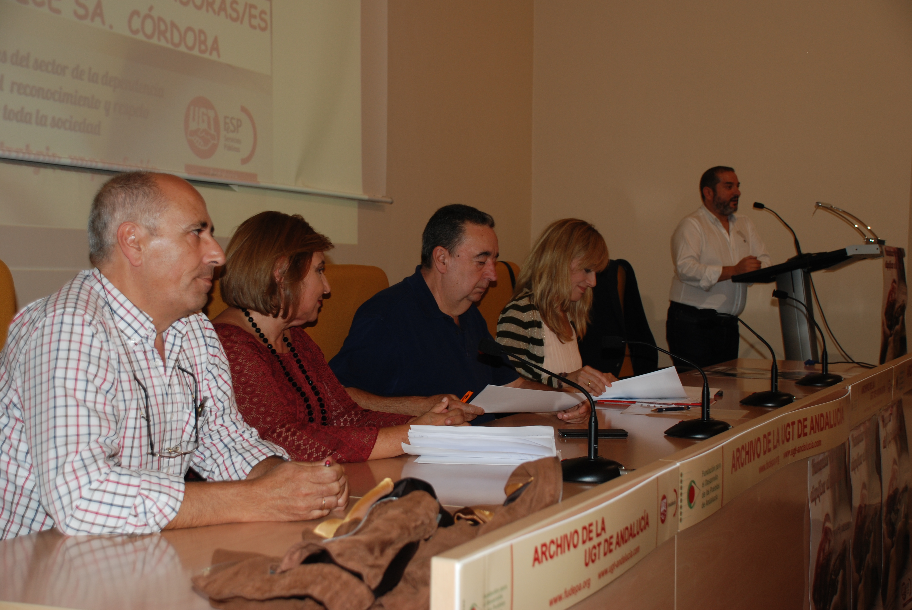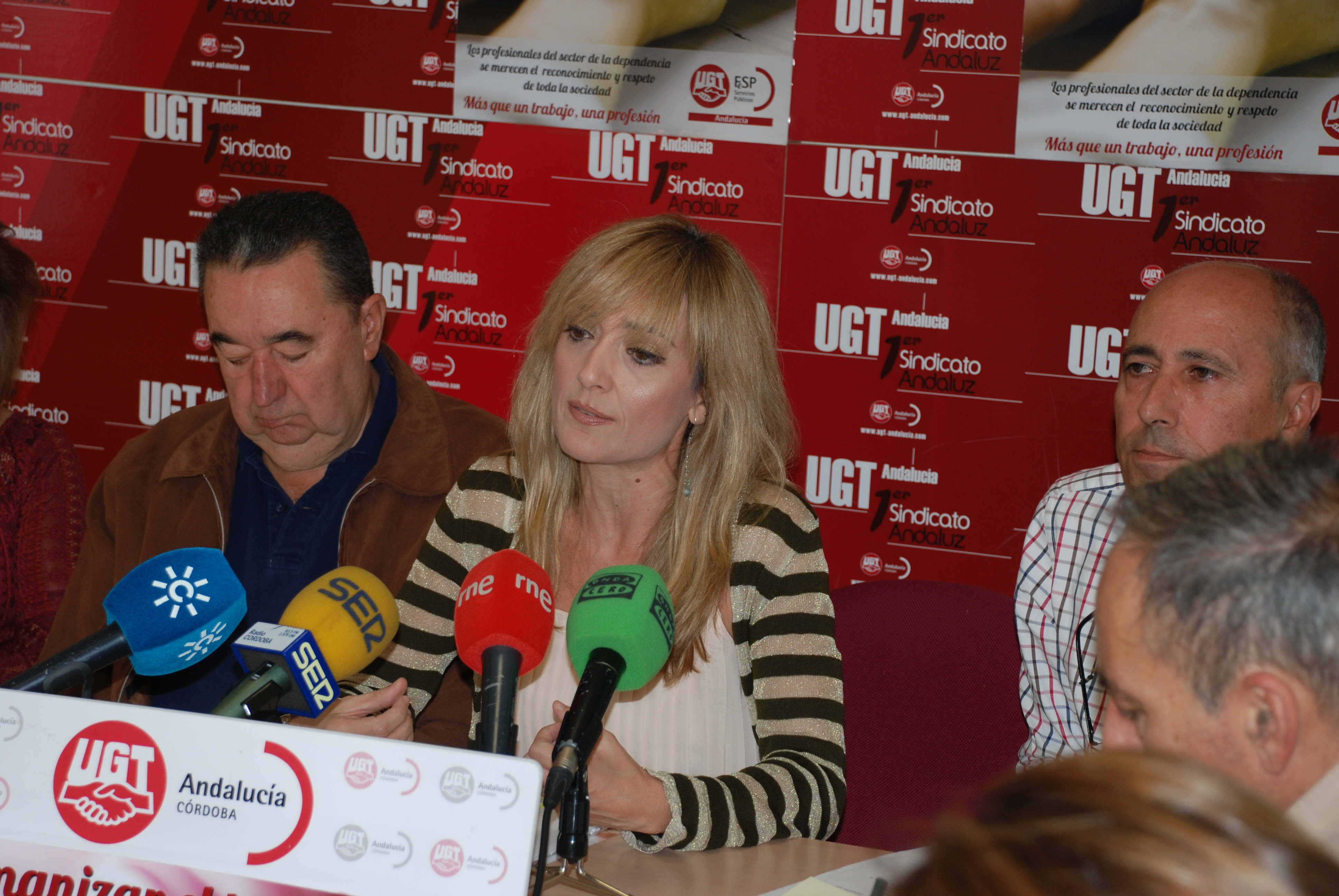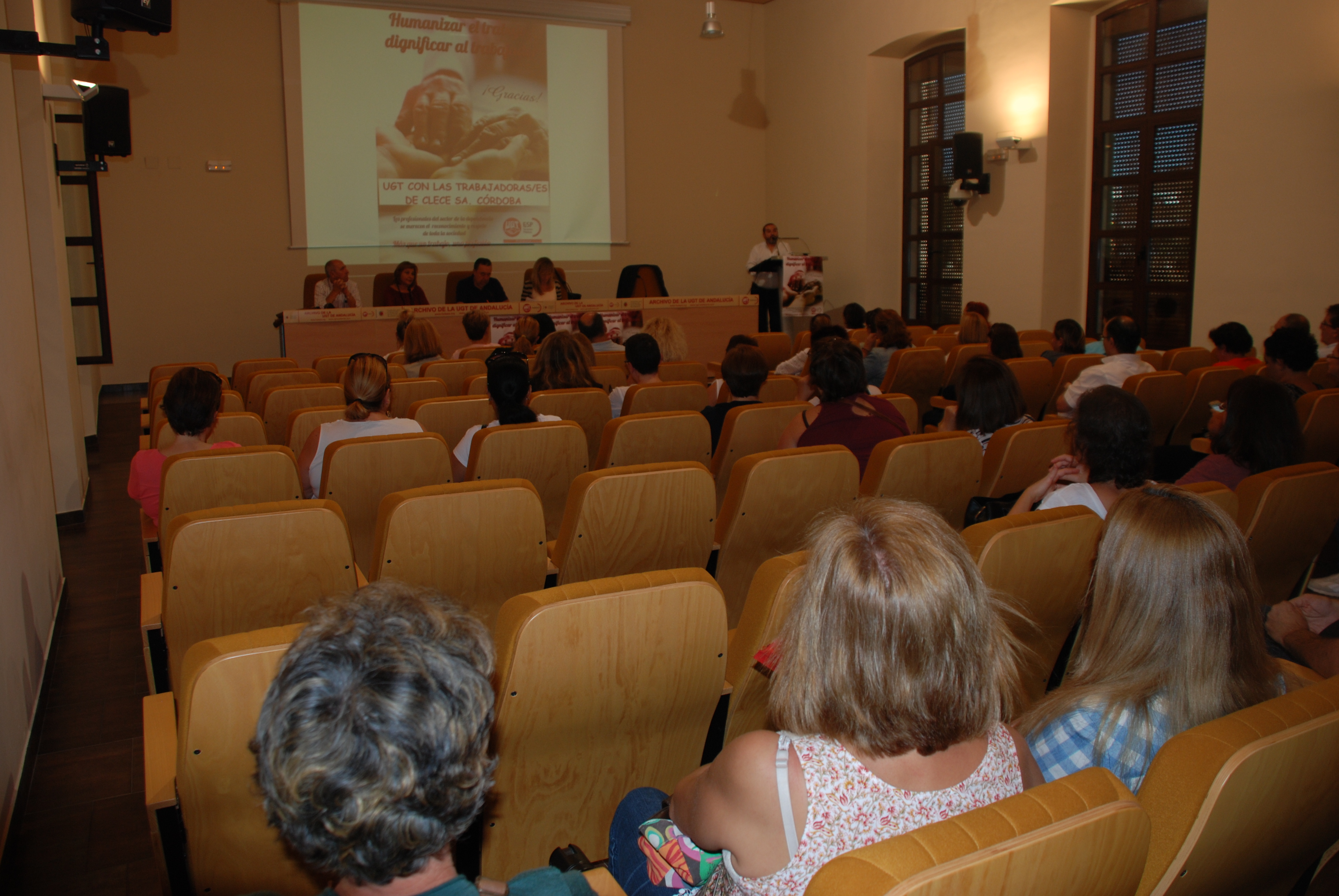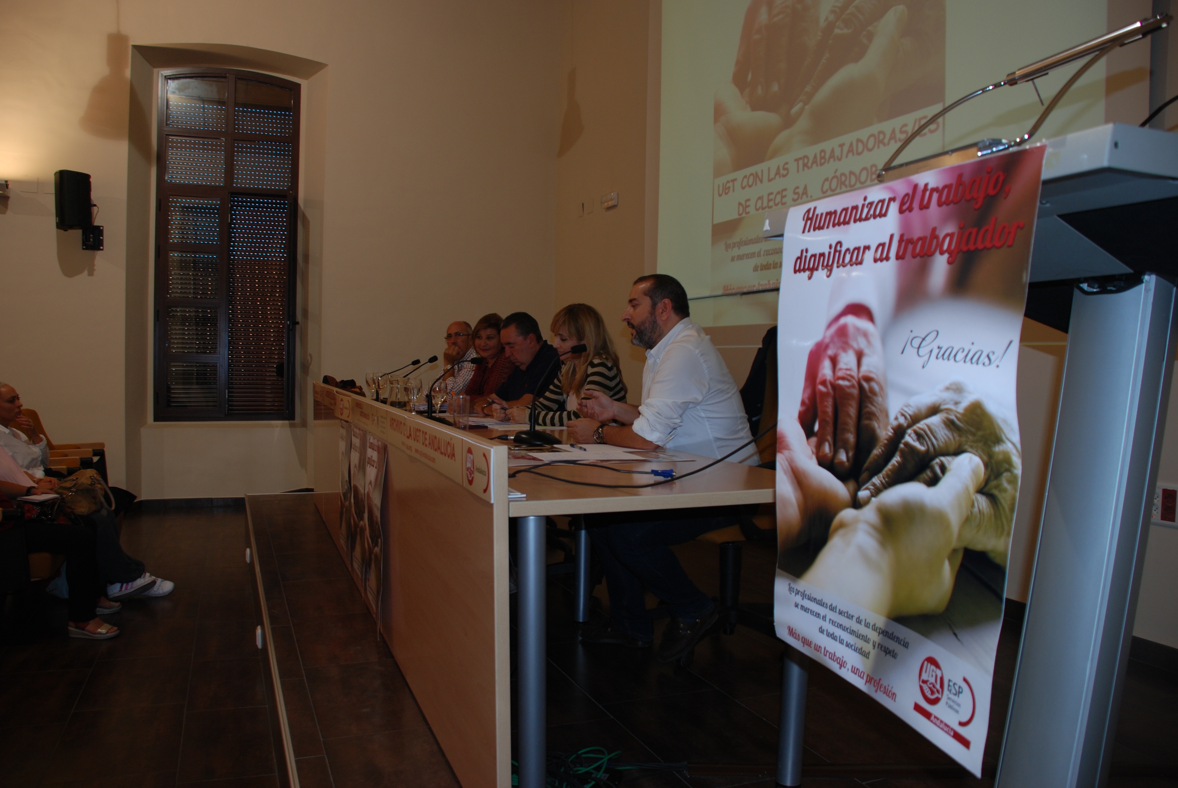 La Jornada comenzó con una rueda de prensa en la que intervinieron Carmen Castilla, Secretaria General de UGT Andalucía; Antonio Tirado, Secretario General de FeSP-UGT Andalucía; Isaías Ortega, Secretario General de FeSP-UGT Córdoba y Rosario Crespo, Responsable de la Sección Sindical de Ayuda a Domicilio de FeSP-UGT Córdoba. En dicha rueda de prensa, se puso de manifiesto la importante labor y el magnífico trabajo que están realizando las compañeras y compañeros de la Sección Sindical de UGT en la empresa CLECE, en la que, en unos años, han conseguido con su acción sindical convertir hasta el 80% de la plantilla en personal indefinido y, entre otras muchas cuestiones, la readmisión de muchas trabajadoras y trabajadores que habían sido despedidos de manera improcedente.