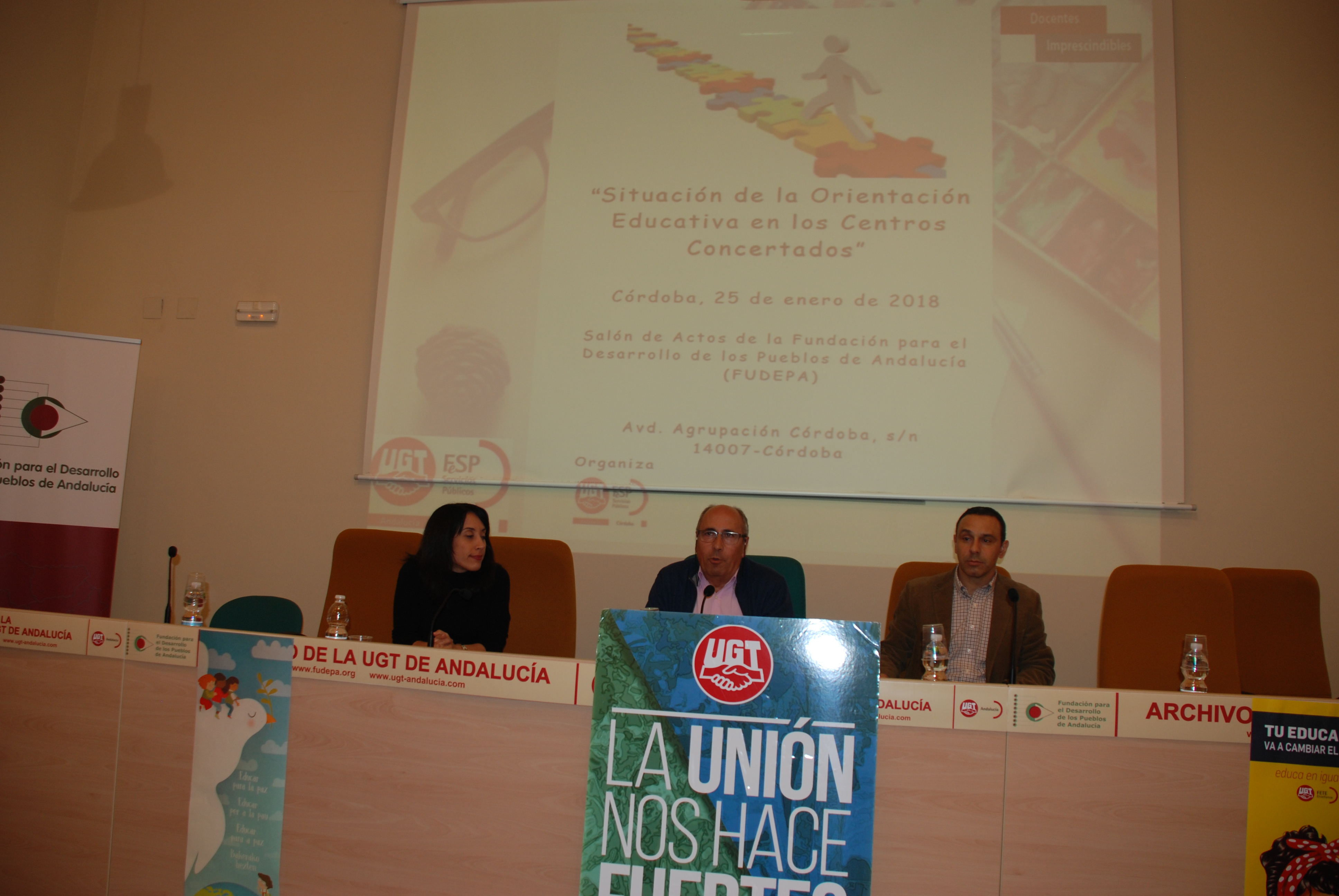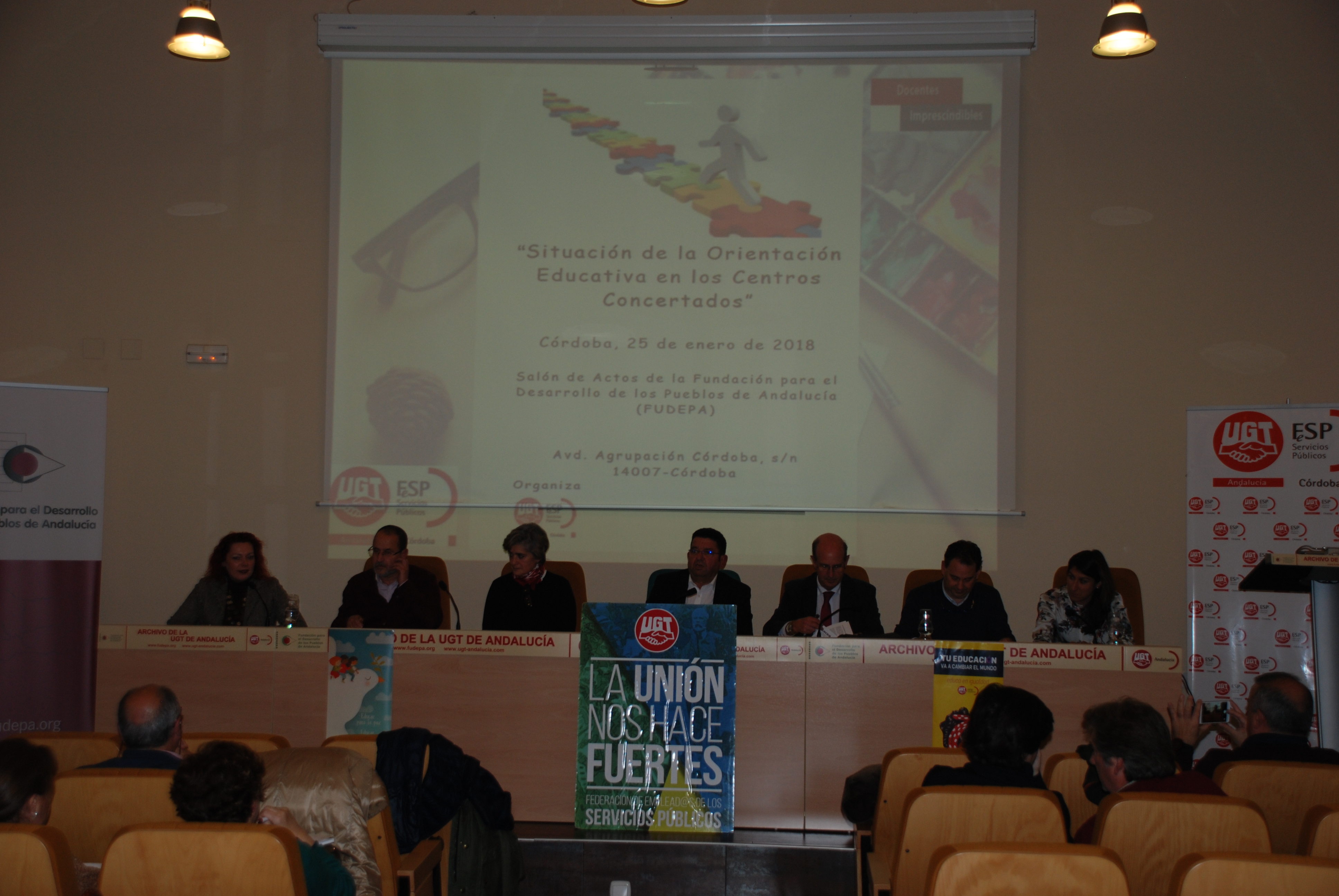 Esta jornada de trabajo, celebrada ayer jueves 25 de enero, organizada por nuestra Federación, puso de manifiesto la situación laboral de los trabajadores dedicados a la Orientación y de cómo  este colectivo, sufre una inexcusable deficiencia de horas para el desempeño de sus funciones, llevándolo a la frustración e imposibilidad del cumplimiento de sus obligaciones. Teniendo en cuenta la repercusión de esta situación en los alumnos, familias y profesiones implicados, desde UGT se hizo un llamamiento a profesionales del sector, titularidades y patronales para que se sumen a la propuesta de ampliación de horas de pago delegado que se llevará a la Mesa de la Concertada, por parte del sindicato.