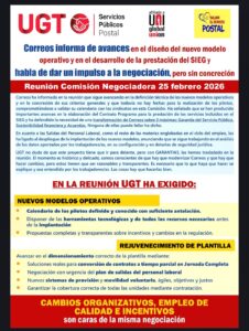 Los representantes de UGT asisten a la reunión de la Comisión negociadora celebrada el día 25 de Febrero, donde exigen que los cambios operativos que pretende la empresa deben ir ligados a empleo de calidad e incentivos que mejoren el sueldo de los trabajadores y trabajadoras.